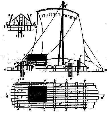 плот с гуарами, хитроумной системой выдвижных досок-килей, которые