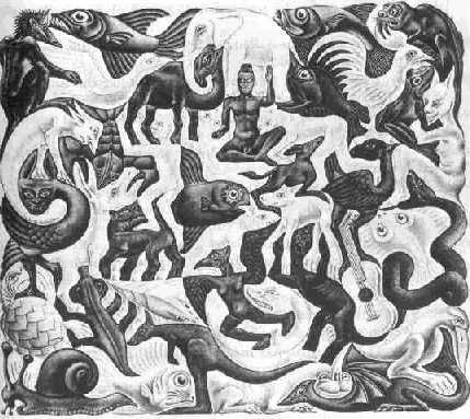 Ахилл: Да, я вижу, что их "отрицательное пространство" - то, что останется, если из литографии вырезать все черные существа, - определяет контуры всех белых существ.
