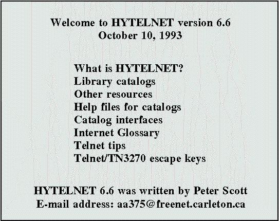 Список в центре экрана -- это позиции меню. Пользователь перемещается по ним при помощи клавиш-стрелок и нажатием Enter выбирает нужное. Идентификатор и пароль пользователя, которые хранятся в базе данных Hytelnet, вводятся программой автоматически. При оценке полезности такой программы следует учитывать тот факт, что реальные распределенные базы данных типа тех, что разрабатываются в рамках WWW, по своему объему еще не могут сравниться с существующими локальными информационными системами, и при доступе к этим системам (например, базы данных STN, Alisa и т.п.) Hytelnet дает равные услуги с системами Gopher, WAIS, WWW.