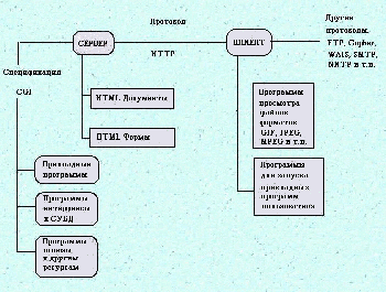 Прикладное программное обеспечение, работающее с сервером, можно разделить на программы-шлюзы и прочие. Шлюзы -- это программы, обеспечивающие взаимодействие сервера с серверами других протоколов, например ftp, или с распределенными на сети серверами Oracle. Прочие программы -- это программы, принимающие данные от сервера и выполняющие какие-либо действия: получение текущей даты, реализацию графических ссылок, доступ к локальным базам данных или просто расчеты.