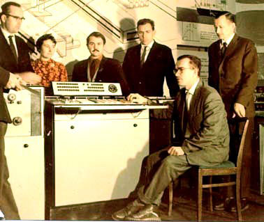 В.М.Глушков за пультом ЭВМ "Днепр" (1960 г.). Стоят: В.И.Скурихин, Л.А.Корытная, Л.А.Жук, В.С.Каленчук, Б.Н.Малиновский.