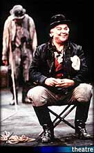 Estragon, sitting on a low mound, is trying to take off his boot. He
