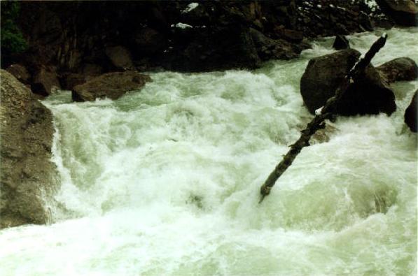 Повреждения: Две согнутые поперечины у ката Кирилла и Сереги, сломанная кница левого баллона третьей поперечины и погнутая в этом месте продолина у "Хавроньи". При разборе полетов были сделаны выводы, что в стабильном состоянии (нахождение Гули с катом в улове у левого берега под "Прощай Родина") не следует хватать первую попавшуюся морковку (которая может оказаться и без карабина) а ждать стопроцентного шанса. С параллельной группой возникли некоторые трения по поводу, что мы всей группой сняли страховку у "Прощай Родина" и ушли в догонку за перевернувшимся катом, создав тем самым трудности в прохождении порога их группе, четверка которой также ушла за Гулей. В наше оправдание можно привести доводы о том, что положение параллельной группы было конечно тяжелым, но не критическим, в отличии от нас, учитывая, что Гулю унесло в каньон и никакой информации о ней мы не располагали. Причем, учитывая далеко не нулевую вероятность оверкиля, в "Сосновом" нам могли понадобится все наши суда. 5 мая. Подъем в 7:00. Вышли в 10:19. До начала каньона "Малый Блып", заканчивающимся порогом "Щель" около 10-12 минут ЧХВ. Ориентир начала каньона - река делает правый, а затем крутой левый поворот, перед правым поворотом - входом в каньон у левого берега обломок скалы пиромидальной формы и завал плавника. Дорога подходит к реке и хорошо видна с воды. Через 150 м. крутой правый поворот с прижимом к скальному выступу и косой бочкой у левого берега. Проходили по внутренней стороне поворота, заходя у правого берега. Далее следует технический участок с маневрами между камней. На выходе из Каньона русло сужается и реку перегораживает бочка. Слева проносной язык, справа пенный котел. Кирилл с Серегой опять залегли. Кирилл зацепился за кат и его вынесло из бочки, Сергей остался полоскаться. Единственное, что мы успели это уйти чуть влево и упали в бочку гадая, не раздавили ли Сергея. Когда мы прошли бочку и я оглянулся назад у меня внутри все похолодело - Сергея в бочке не было. Правда спустя секунду я увидел его плывущего чуть правее нас. После выхода из "Щели" участок спокойной воды. Волков благополучно добрался вплавь (кролем) до берега, выпустив при этом весло, которое было поймано нашим катом. После поимки Серегиного весла мы и подоспевший Макс занялись спасением катамарана с Кириллом.Однако затолкать кат и плавающего рядом человека в улово не удалось. Кирилл был взят на борт (скорее на раму) двойки, а перевернутый кат был передан подоспевшей четверке. Кирилл был высажен на берег, а двойка и каяк ушли вдогонку за четверкой и перевернутым катом. Но, как оказалось, они и сами люди взрослые и, когда мы подошли, двойка уже была загнанна в улово (11:50). У девичьей двойки при прохождении каньона порвался упор и им пришлось зачалиться в середине каньона. Их ждали около часа (починить упор им помогали Макс с Лехой). в 12:50 отплыли дальше. До автомобильного моста (ориентир начала "Соленых скал" 10 минут ЧХВ. По дороге есть места для стоянок. Чалка за
