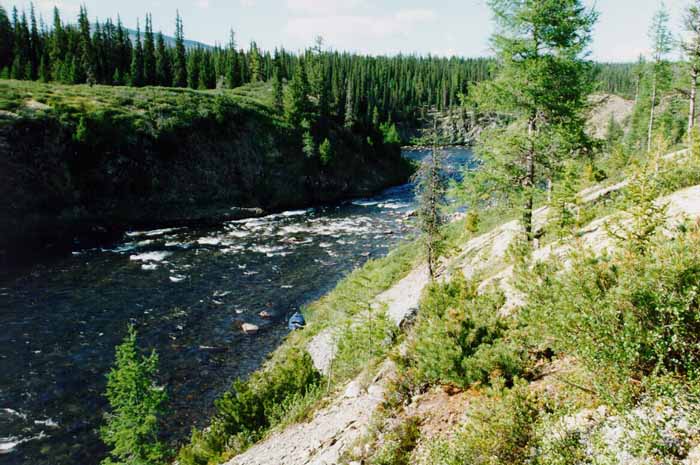 Здесь находится порог Горло. Река около полукилометра прижимается к скальной