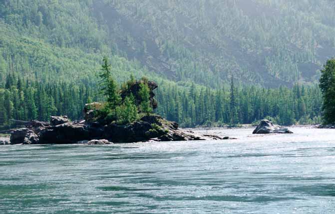 Мы слегка не укладывались в график, и поэтому был назначен ранний (для нас, конечно) подъем. Встали в 8 (как нам казалось, в несусветную рань) и начали собираться. Наше самолюбие было уязвлено проплывавшей мимо группой из двух катов (это называется мы быстро собирались!). С катов спросили откуда мы и собирались проплывать дальше, как тут Митяй узнал в катамаранщиках челябинцев, с которыми мы стояли на Хойто-Голе. Когда Митька представился, с катамаранов раздался крик "Чалка!!!". Всегда приятно встретить знакомых людей (если это хорошие люди). Челябинцы пообщались с нами и, оставив нам в подарок молодой вареной картошки и оладьев, двинули дальше.