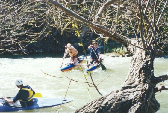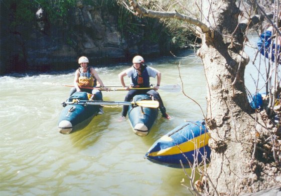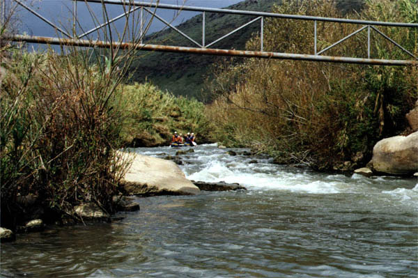 Поспасав друг друга, собираемся в путь. Перед нами участок маршрута, который на иврите называется "Maim soarim" (бурная вода?). Экипажи немного перетасованы: Вова пересаживается на двойку, а Маша - на четверку. Обносим небольшой обмелевший участок (вообще, воды, говорят, маловато - около 10 кубов. На Иордане очень короткий сезон - 2-3 месяца). Начали. Начинаются пороги. "Первые камни", за ними заходим в улово и ждем остальных. У меня опять сдулась подушка, уже вторая по счету. Делать нечего, привязываем к раме канистру с водой и я на нее восседаю. Судьба-злодейка на что-то намекает, но как-то уж слишком тонко.