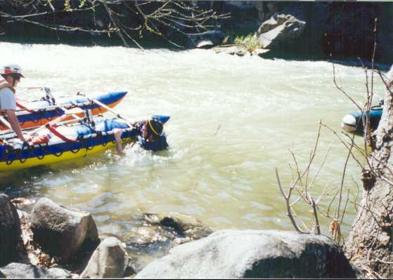 Теперь Юля пробует с Мишей. Разгоняются, входят в струю... Неудача. Садятся на камень и струя начинает их потихоньку загонять все выше, крен увеличивается. Миша прыгает с нижнего баллона на верхний, но видимо слижком резко: оверкиль. Первый наш неучебный киль. В тот момент, когда их проносит мимо, я совершенно инстинктивно хватаюсь за спасконец и кидаю его прямехонько на перевернутую двойку. Далее последовательность событий такова: Юля ловит спасконец, но при этом, видимо, упускает весло. Миша отправляется вплавь за веслом. Я начинаю вытягивать спасконец (видимо, от волнения перестал соображать: нет чтобы дождаться, пока их самих к берегу прибьет). Веревка начинает натирать Юле руки, Юля отпускает и веревку. Очень вовремя, так как как раз в этот момент оказывается, что спасконец ни к чему не привязан и я оказываюсь вместе с оным по пояс в воде. Корман с Вовой на второй двойке спасают Юлю и ее катамаран, по берегу прибегает Миша с двумя веслами. Уф-ф-ф! Ндааа, ну и балбесы мы...