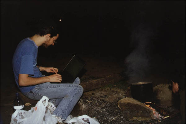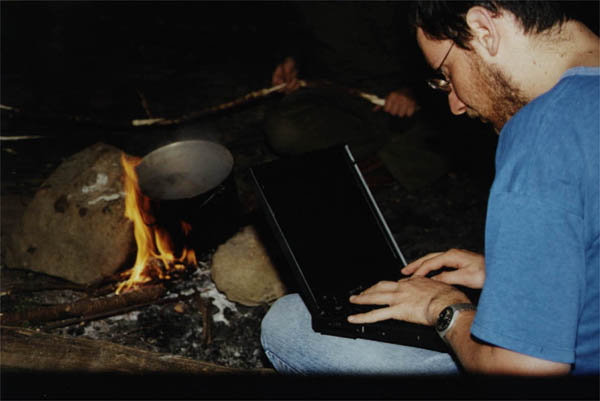 Примерно в это время Женя убил всех наповал, притащив к костру свой лэптоп, запустив PowerPoint и усевшись работать. Однако применение им нашлось: Женя светил экраном в котел и определял степень готовности макарон. Еще его собирались заставить раздувать компьютером костер, но дрова были сухие, горели хорошо и нужда в чуде современной техники отпала.