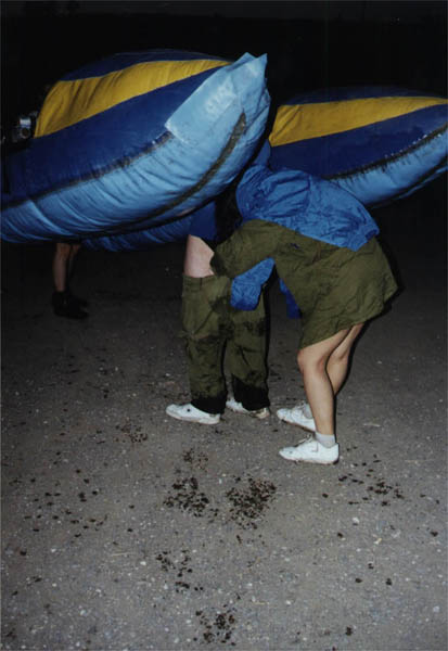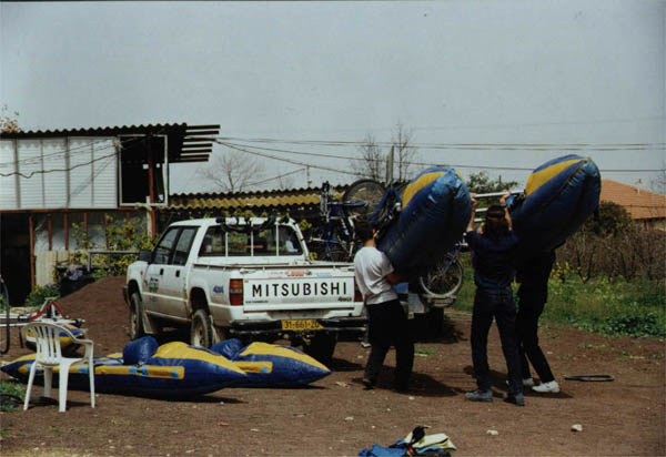 Загружаемся. Кормановскую двойку - на его же машину. Остальные каты - на тендер, одолженный Мишей у проживающего в мошаве владельца (?) велосипедно-прокатной конторы. Грузим так: сначала - четверка килем вниз, под углом 40o к горизонту. На нее, килем кверху - двойку (невероятно, но факт: после получаса езды в таком положении двойка, которая была сверху, сдулась практически до минимальных своих размеров). Получилась эдакая абстрактная композиция под кодовым названием "наш ответ катюшам".